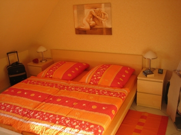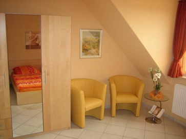 Zusätzlich in beiden Schlafräumen sind Sitzecken eingerichtet. Bei Ankunft sind die Betten bereits bezogen. Es steht für jeden Besucher ein Herrendiener bereit. Der dreitürige Schrank mit Ganzkörperspiegel bietet ausreichend Stauraum. Aus dem Fenster besteht ein erholsamer Blickkontakt zum nahen Deich. |